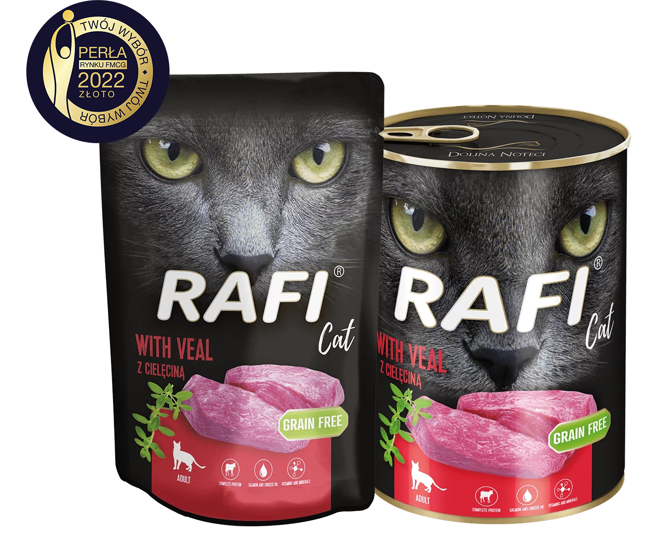 Rafi Cat Food with veal is a food to support your pet’s optimal body weight and well-being. With up to 65% calf meat and animal products, it is a natural source of trace and macro elements, vitamins, fatty acids and amino acids such as lysine, methionine, phenylalanine, and taurine, which is essential in cat nutrition. Rafi Cat meal is based on the natural nutritional needs of cats; it fully covers the demand for components necessary for the proper functioning of pet’s body. Additionally, appropriately composed recipe makes the cat consume easily digestible and at the same time high quality protein, which is the main source of energy. The product has been prepared by animal nutritionists and does not contain added cereals, preservatives or colourings. This makes it exceptionally appetising for your cat.