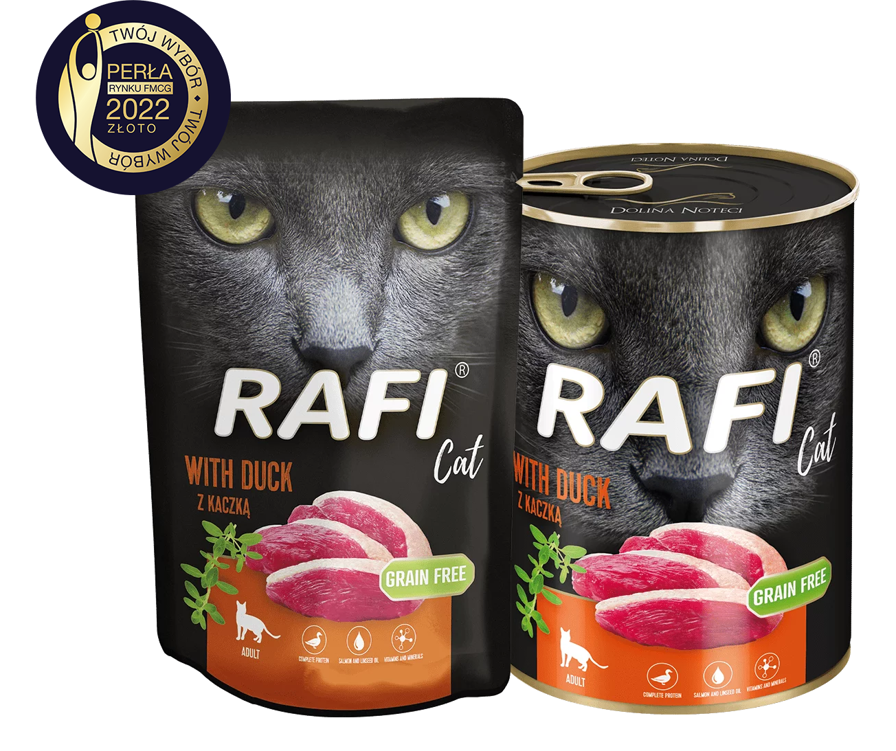 Rafi Cat food with duck is a complete product composed appropriately to meet all the specific nutritional requirements of cats – carnivores. The most important advantage of the food is its high content of meat and products of animal origin, which are a valuable source of complete protein. They also provide fat and arachidonic acid, essential for the cat’s proper functioning. Additionally, meat and products of animal origin, linseed oil, salmon oil, balance the cat’s diet with polyunsaturated fatty acids, both of n-3 and n-6 family. The addition of taurine to the cat food meets the necessary requirement covering the cat’s need for this amino acid, thus ensuring proper digestion of fats and proteins. The correct ratio of calcium to phosphorus contributes to maintaining homeostasis of these elements in the body and bone mineralisation at a constant level. Iodine ensures correct metabolic processes of all nutrients.
