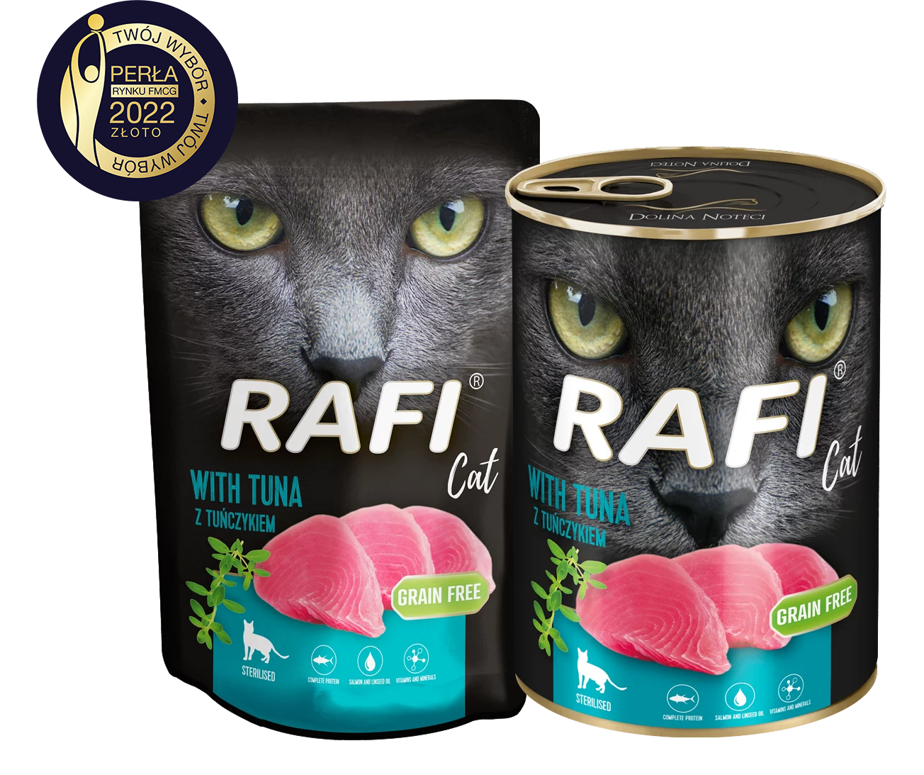 RAFI Cat for sterilised cats, thanks to careful selection of raw materials and additives, meets the specific nutritional needs of such cats and ensures maintenance of correct body weight. Tuna is a source of very easily digestible protein with high biological value, as well as of valuable fatty acids. The addition of L-carnitine the effectiveness of fatty acid metabolism, thanks to which general metabolism is accelerated, minimising the risk of excessive weight gain and obesity. The careful production method and precise selection of raw materials means that the food is easily digestible, featuring high absorbability of all of its nutrients, and is perfectly suited to the needs of sterilised adult cats of all breeds.