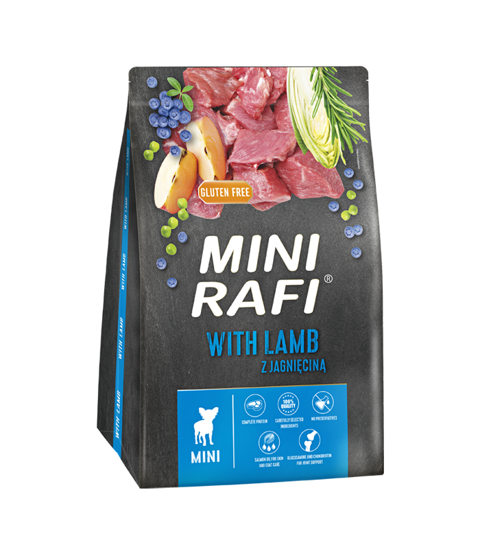 Z myślą o dorosłych psach małych ras stworzyliśmy karmę suchą Mini Rafi z jagnięciną, którą cechuje wyjątkowy smak, wiele cennych dodatków, wysoka zawartość pełnowartościowego białka i ważnych dla psa kwasów tłuszczowych. Jej receptura została skomponowana w taki sposób, by pokrywać zapotrzebowanie na wszystkie niezbędne składniki odżywcze, mineralne i witaminy. Dzięki temu zapewnia utrzymanie prawidłowej pracy organizmu, dobrej kondycji i zdrowia dorosłych psów małych ras.
