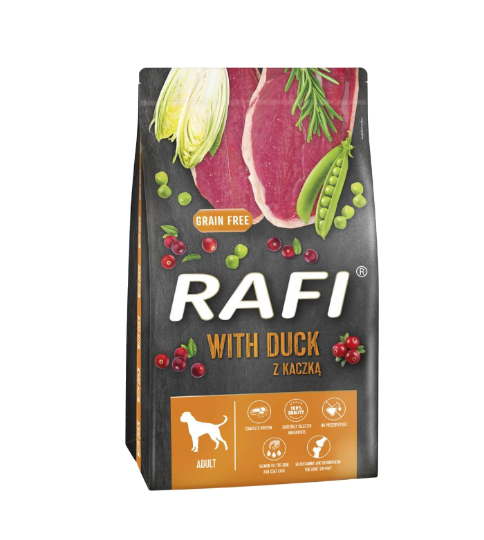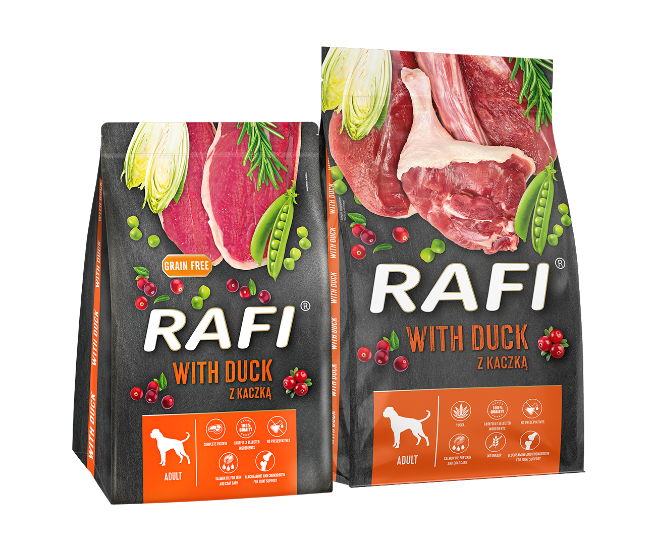 Wyjątkowy smak, wiele cennych dodatków, wysoka zawartość pełnowartościowego białka i ważnych dla psa kwasów tłuszczowych – taka właśnie jest sucha karma Rafi z kaczką. Jej receptura została skomponowana w taki sposób, by pokrywać zapotrzebowanie na wszystkie niezbędne składniki odżywcze, mineralne i witaminy. Dzięki temu zapewnia utrzymanie prawidłowej pracy organizmu, dobrej kondycji i zdrowia dorosłego psa. Kaczka jest surowcem szczególnie bogatym w łatwostrawne białko o wysokiej zawartości aminokwasów egzogennych oraz tłuszczu bogatego w wielonienasycone kwasy tłuszczowe. Obecność zarówno oleju z łososia, jak i siemienia lnianego zapewnia prawidłowe proporcje kwasów tłuszczowych n-3 i n-6, które niwelują ryzyko powstawania procesów zapalnych. Glukozamina i siarczan chondroityny, czyli substancje chondroprotekcyjne, poprawiają amortyzację stawów, zmniejszając dolegliwości bólowe w chorobie zwyrodnieniowej stawów. Wartość odżywcza oraz gęstość energetyczna karmy Rafi z kaczką gwarantują spokojny i wydajny pasaż jelitowy, podczas którego składniki odżywcze są powoli uwalnianie i efektywnie wchłaniane. Dodatek owoców i warzyw – żurawiny, batatów, groszku oraz marchwi podnosi smakowitość suchej karmy oraz jej atrakcyjność sensoryczną.