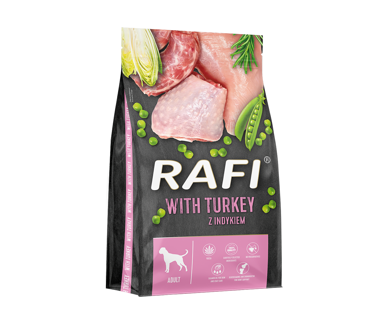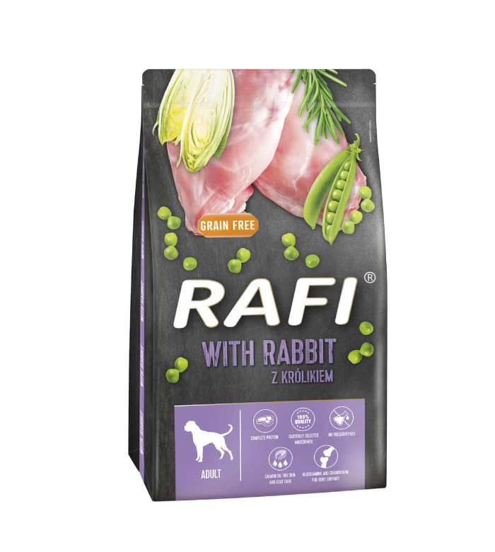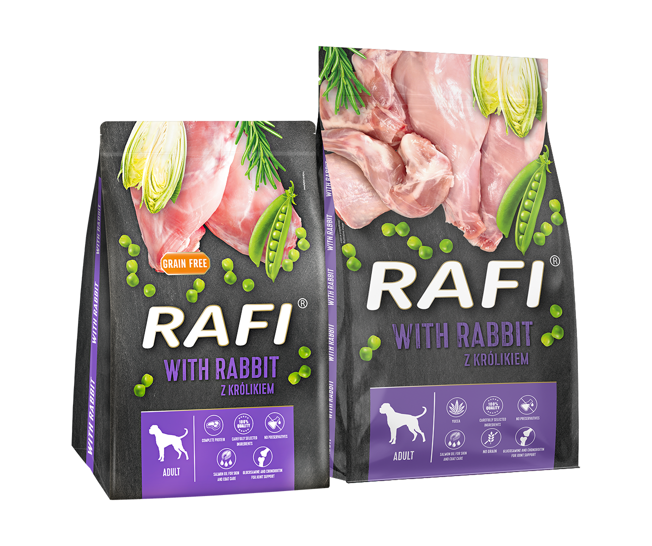 Jeśli sucha karma to ulubiony przysmak Twojego psa, podaj mu nową karmę Rafi z królikiem. Jej receptura uwzględnia zapotrzebowanie na wszystkie składniki odżywcze niezbędne do zachowania zdrowia i dobrej kondycji dorosłego psa. Surowce pochodzenia zwierzęcego wykorzystane w produkcji są źródłem wysokiej jakości pełnowartościowego białka, tłuszczu oraz wszystkich niezbędnych składników mineralnych i witaminowych. Królik jest surowcem szczególnie bogatym w łatwostrawne białko o wysokiej zawartości aminokwasów egzogennych. Olej z łososia i siemię lniane zapewniają prawidłowe proporcje kwasów tłuszczowych n-3 i n-6. Z kolei chondroprotetyki – glukozamina i siarczan chondroityny- poprawiają ruchomość stawów, zabezpieczając je przed zmianami w chrząstce stawowej. Dostarczenie składników o właściwościach prebiotycznych (fruktooligosacharydów, w tym inuliny oraz mannanooligosacharydów) sprzyja utrzymaniu równowagi w przewodzie pokarmowym, co w konsekwencji przekłada się na wiele funkcji życiowych dorosłego psa.
