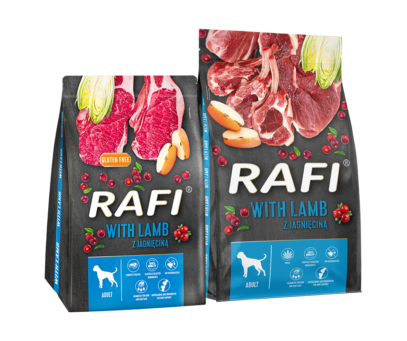 Szukasz produktu, który urozmaici codzienną dietę Twojego pupila? Jeśli tak, to dobrze trafiłeś – przedstawiamy nową suchą karmę Rafi z jagnięciną. To produkt pełen wartościowych składników odżywczych, minerałów oraz witamin niezbędnych do zachowania zdrowia i dobrej kondycji dorosłego psa. Wysokiej jakości surowce pochodzenia zwierzęcego wykorzystane w produkcji są źródłem pełnowartościowego białka, a wraz z nim aminokwasów egzogennych oraz cennych kwasów tłuszczowych n-3 i n-6. Ich odpowiednie proporcje zapewnia również dodatek oleju z łososia. Siarczan chondroityny i glukozamina chronią stawy psa, poprawiając ich amortyzację oraz zwiększając elastyczność tkanki łącznej. Na prawidłowe funkcjonowanie przewodu pokarmowego znaczący wpływ ma obecność składników o charakterze prebiotycznym, m.in. fruktooligosacharydów, inuliny i mannanooligosacharydów, które stymulują namnażanie pożytecznych bakterii bytujących w jelitach, przyczyniając się do wspierania naturalnej odporności organizmu psa.