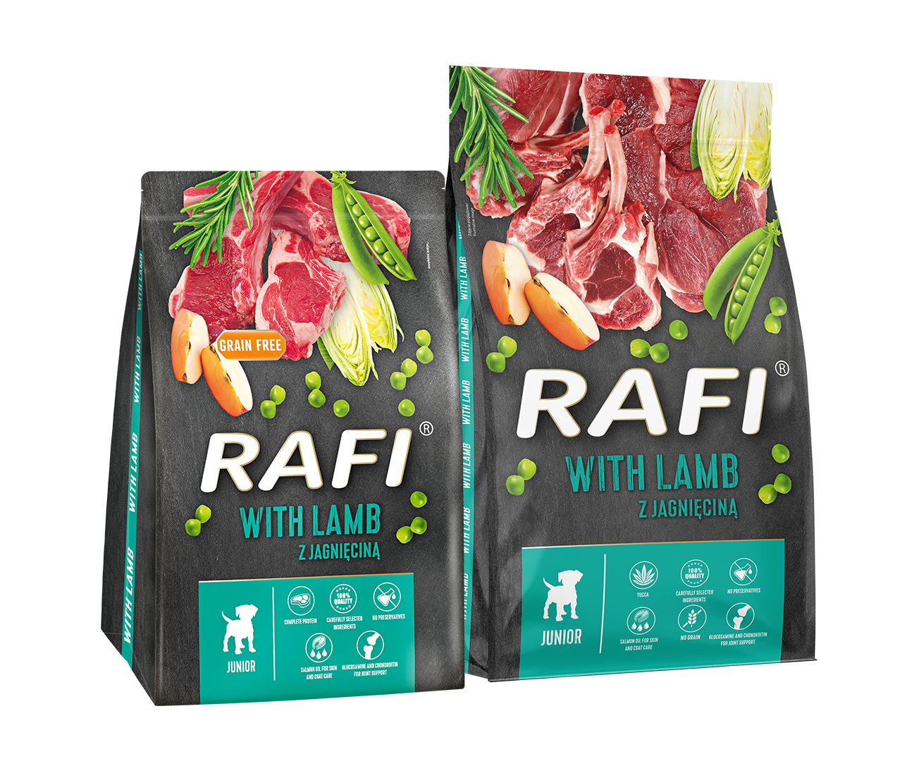 Zastanawiasz się jakimi produktami urozmaicić codzienną dietę szczeniąt i młodych psów? Sucha karma Rafi z jagnięciną to idealne rozwiązanie. Ten pełnowartościowy posiłek został zbilansowany pod kątem zawartości niezbędnych składników odżywczych, witamin i minerałów, warunkujących prawidłowy wzrost szczeniąt i młodych psów. Olej z łososia oraz dodatek siemienia lnianego zapewniają prawidłową ilość kwasów tłuszczowych n-3 i n-6. Dostarczenie ich jest szczególnie ważne we wczesnej fazie rozwoju młodego organizmu. Z kolei odpowiednie proporcje wapnia do fosforu pozytywnie wpływają na funkcjonowanie układu kostnego. Zadaniem substancji chondroprotekcyjnych, czyli siarczanu chondroityny i glukozaminy, jest stabilizacja rozwoju tkanki chrzęstnej, a tym samym zapewnienie prawidłowej ruchomości stawów w dorosłym życiu. Wzbogacenie suchej karmy Rafi o składniki prebiotyczne – w tym fruktooligosacharydy, inulinę oraz mannanooligosacharydy, sprzyja utrzymaniu równowagi mikroflory jelitowej w przewodzie pokarmowym, co w konsekwencji przekłada się na wiele funkcji życiowych młodego psa.
