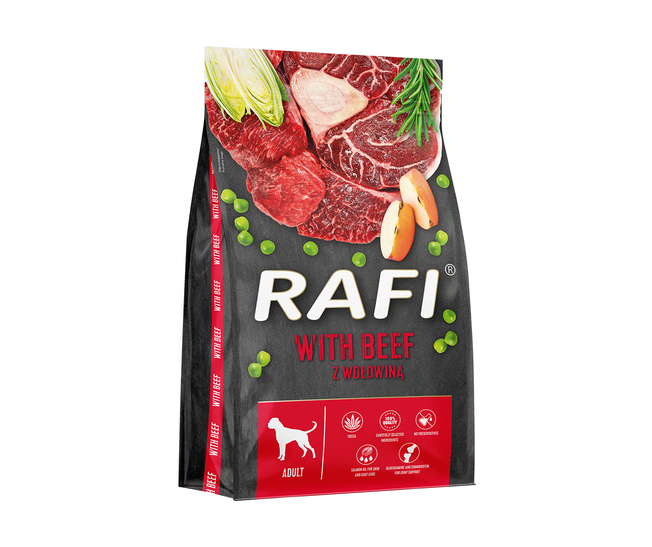 Rafi z wołowiną to zbilansowana karma sucha dla dorosłych psów wszystkich ras. Przy zapewnieniu zwierzęciu odpowiedniej ilości świeżej wody stanowi pełnoporcjowy posiłek, który całkowicie pokrywa zapotrzebowanie na wszystkie składniki odżywcze. Mięso i produkty pochodzenia zwierzęcego, w tym wołowina, dostarczają psu wartościowego białka i tłuszczu. Dodatkowo olej z łososia stanowi źródło kwasów tłuszczowych z rodziny n-3, co sprzyja utrzymaniu właściwej równowagi między kwasami tłuszczowymi omega-6 i omega-3. Karma zawiera niezbędną ilość wszystkich składników odżywczych, a optymalnie dobrane witaminy i składniki mineralne wspierają zdrowie oraz kondycję. Dodatek drożdży dostarcza witamin i składników mineralnych, a także substancji o charakterze prebiotycznym, które wspierają prawidłowe funkcjonowanie przewodu pokarmowego. Dodatek żurawiny stabilizuje czystość mikrobiologiczną moczu i pomaga chronić pęcherz moczowy przed procesami zapalnymi. Zawarta w karmie witamina A jest niezbędna do utrzymania prawidłowego wzroku, witamina E wspomaga odporność i zapobiega destrukcyjnym efektom działania wolnych rodników, a witamina D3 odpowiada za zdrowe kości i zęby. Z kolei składniki mineralne cynk i mangan dbają o kondycję skóry i sierści, żelazo i miedź wpływają na prawidłowy skład krwi, a jod reguluje właściwą przemianę materii. W karmie zastosowano dodatek chondroprotetyków – glukozaminy i siarczanu chondroityny, które wspólnie chronią tkankę chrzęstną stawów przed uszkodzeniem. Odpowiednia smakowitość karmy sprzyja utrzymaniu właściwego poziomu odżywienia i dobrej kondycji dorosłych psów.