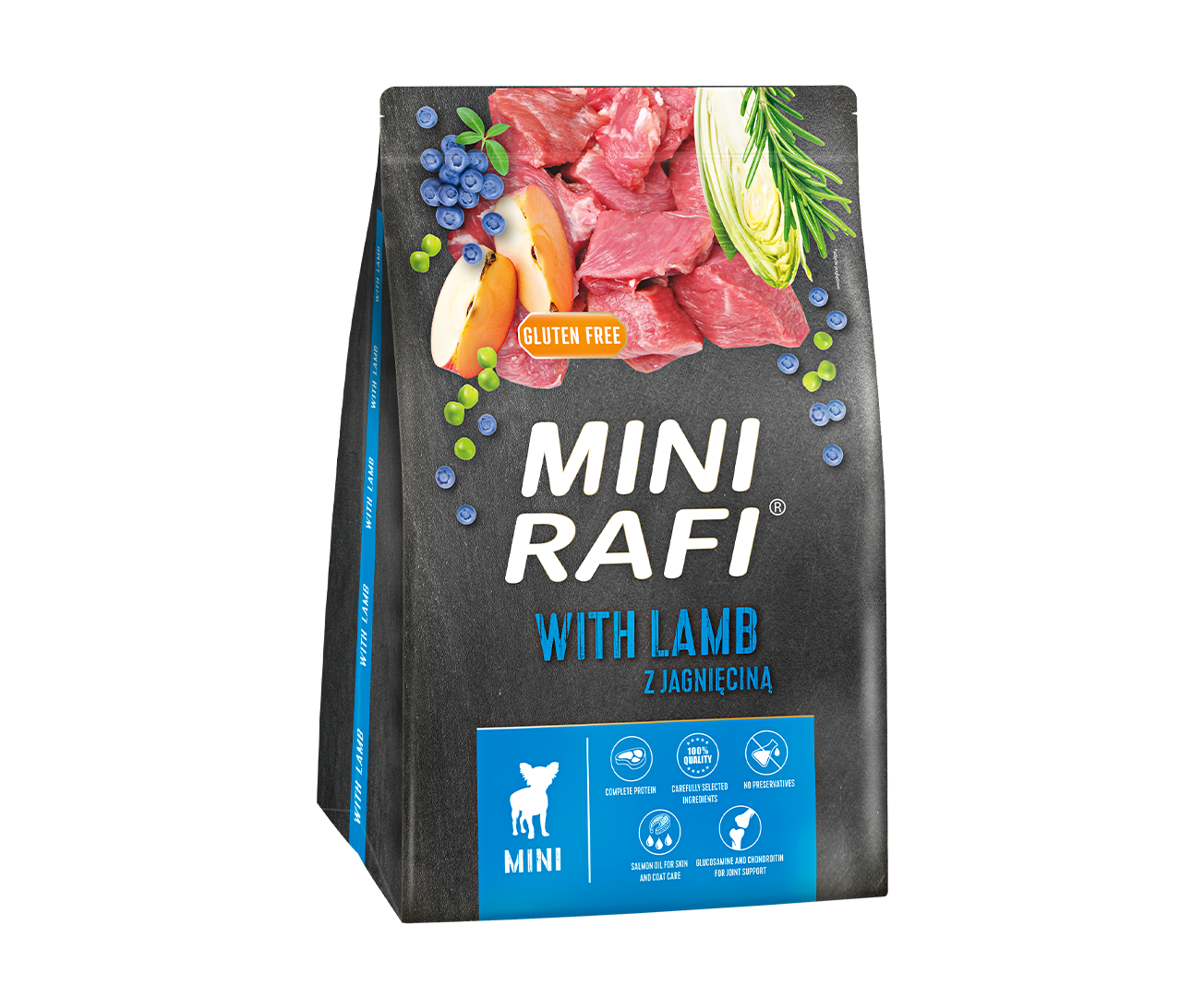 Z myślą o dorosłych psach małych ras stworzyliśmy karmę suchą Mini Rafi z jagnięciną, którą cechuje wyjątkowy smak, wiele cennych dodatków, wysoka zawartość pełnowartościowego białka i ważnych dla psa kwasów tłuszczowych. Jej receptura została skomponowana w taki sposób, by pokrywać zapotrzebowanie na wszystkie niezbędne składniki odżywcze, mineralne i witaminy. Dzięki temu zapewnia utrzymanie prawidłowej pracy organizmu, dobrej kondycji i zdrowia dorosłych psów małych ras. Spożywanie jagnięciny zapobiega chorobom układu krążenia, a także korzystnie wpływa na układ nerwowy, poprawiając refleks i wpływając na większą chęć psa do aktywności. Obecność oleju z łososia zapewnia prawidłowe proporcje kwasów tłuszczowych n-3 i n-6, które niwelują ryzyko powstawania procesów zapalnych. Glukozamina i siarczan chondroityny, czyli substancje chondroprotekcyjne, poprawiają amortyzację stawów, zmniejszając dolegliwości bólowe w chorobie zwyrodnieniowej stawów. Dodatek owoców i warzyw – jabłka, borówki oraz groszku podnosi smakowitość karmy suchej oraz jej atrakcyjność sensoryczną. Przestrzeganie zaleceń dotyczących dawkowania karmy gwarantuje utrzymanie prawidłowej masy ciała psa.