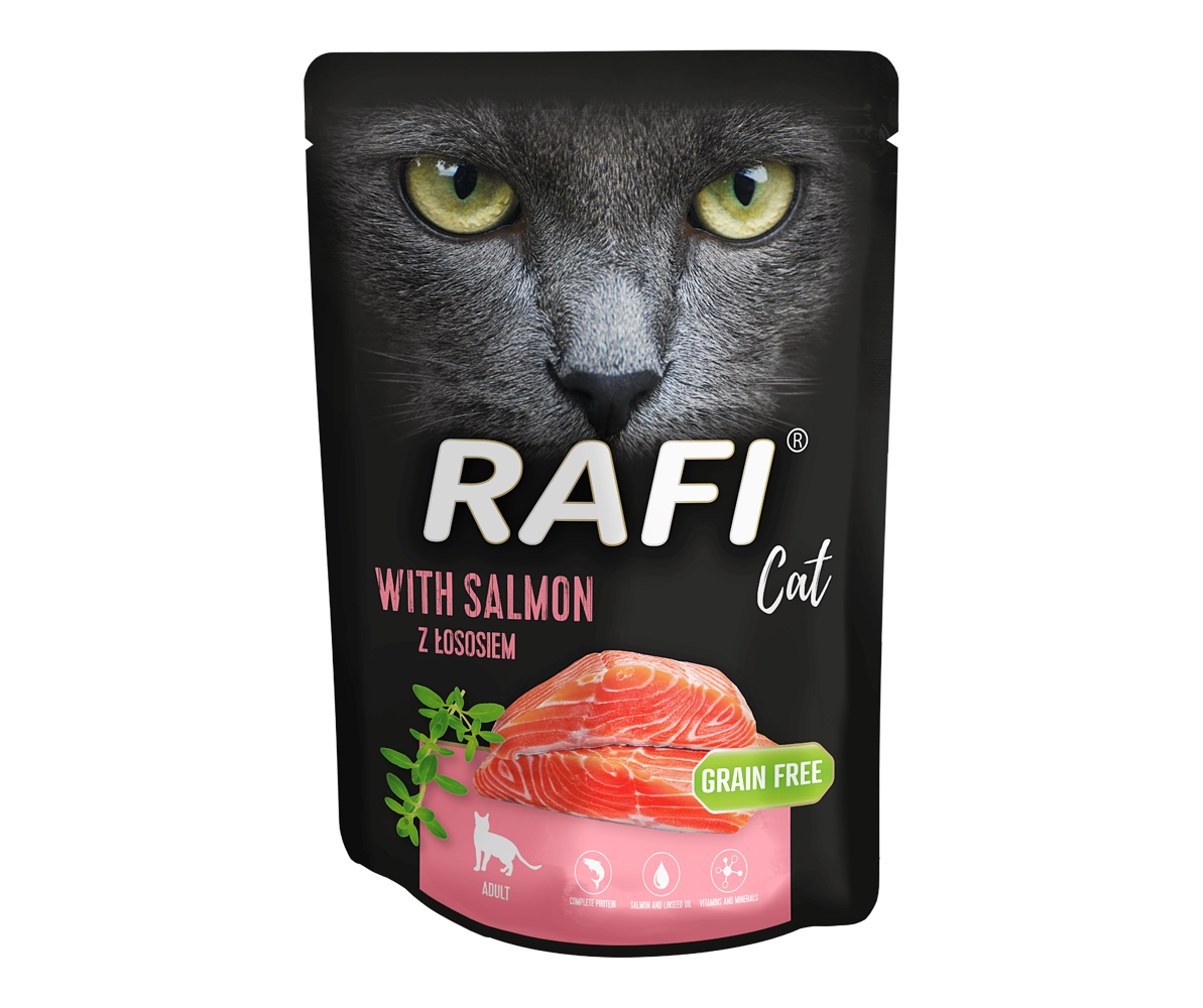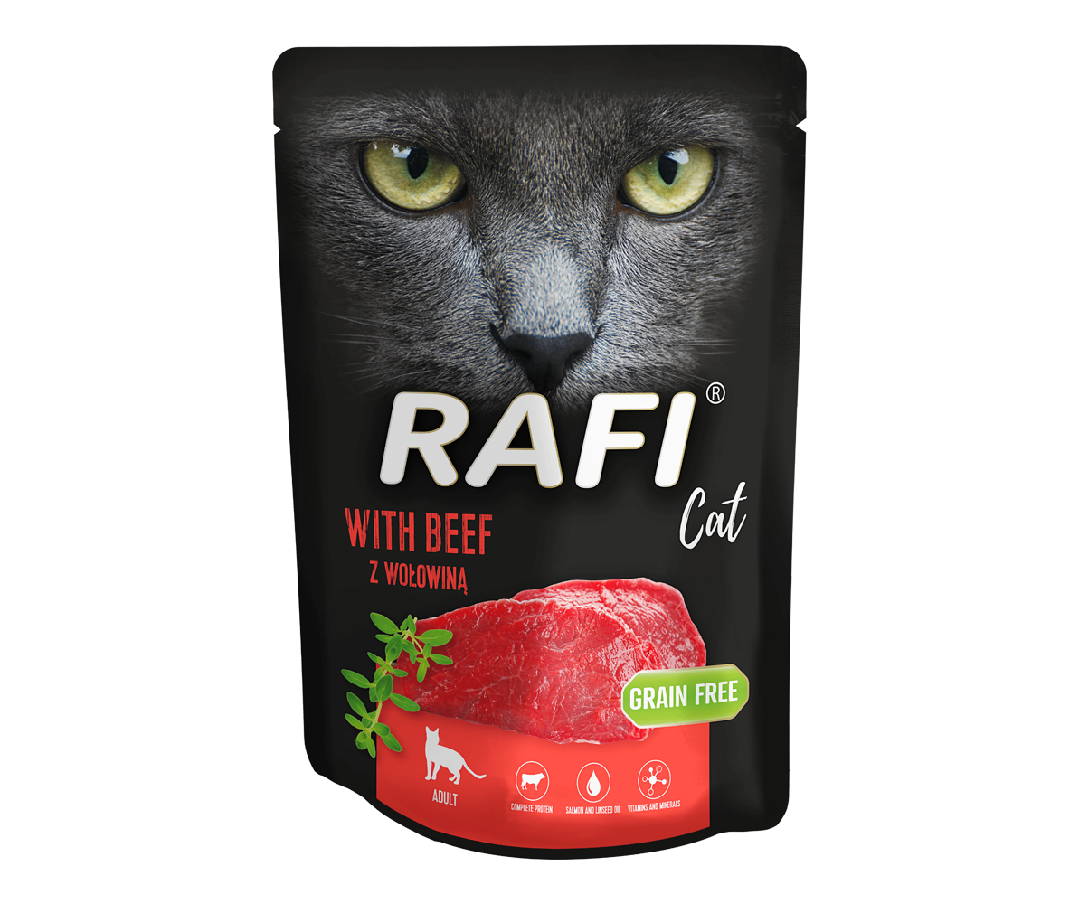 Karma Rafi Cat to pełnoporcjowy produkt o odpowiednio skomponowanym składzie, który spełnia wszystkie specyficzne wymagania żywieniowe kotów – mięsożerców. Najważniejszym walorem karmy jest wysoka ilość mięsa i produktów pochodzenia zwierzęcego, stanowiące cenne źródło pełnowartościowego białka. Dostarczają również tłuszcz oraz kwas arachidonowy, niezbędny do prawidłowego funkcjonowania organizmu kota. Dodatkowo mięso i produkty pochodzenia zwierzęcego, olej lniany, olej z łososia, bilansują dietę kota w wielonienasycone kwasy tłuszczowe, zarówno te z rodziny n-3, jak i n- 6. Dodatek do karm tauryny spełnia niezbędny wymóg pokrywając zapotrzebowanie kota na ten aminokwas, dzięki czemu proces trawienia tłuszczy i białek zachodzi w sposób prawidłowy. Odpowiedni stosunek wapnia do fosforu przyczynia się do utrzymania homeostazy tych pierwiastków w organizmie i mineralizacji kości na stałym poziomie. Jod zapewnia prawidłowy przebieg procesów metabolicznych wszystkich składników odżywczych.