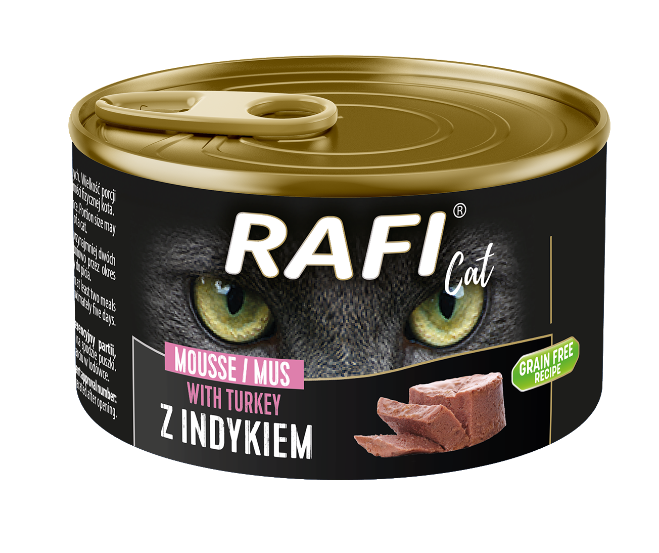 Pełnoporcjowa karma z indykiem dla dorosłych kotów wszystkich ras Rafi MUS w pełni pokrywa ich zapotrzebowanie na składniki odżywcze. Prosty, a jednocześnie wartościowy skład zapewnia dostarczenie białka i tłuszczu o bardzo wysokiej strawności. Odpowiednia tekstura zwiększa zarówno przyswajalność, jak i smakowitość produktu. Dodatek surowców rybnych wzbogaca codzienną dietę kota w kwasy tłuszczowe z rodziny n-3, których rola jest niezwykle cenna na każdym etapie życia. Obecność tauryny odpowiada na metaboliczne potrzeby zwierzęcia. Receptura została precyzyjnie skomponowana pod względem zawartości składników mineralnych, ze szczególnym uwzględnieniem właściwego stosunku wapnia do fosforu. Gwarantuje to prawidłową pracę układów kostnego, mięśniowego i wydalniczego. Ponadto, dzięki mało inwazyjnej metodzie produkcji oraz starannej selekcji surowców, karma jest lekkostrawna i idealnie dopasowana do potrzeb żywieniowych dorosłych kotów.