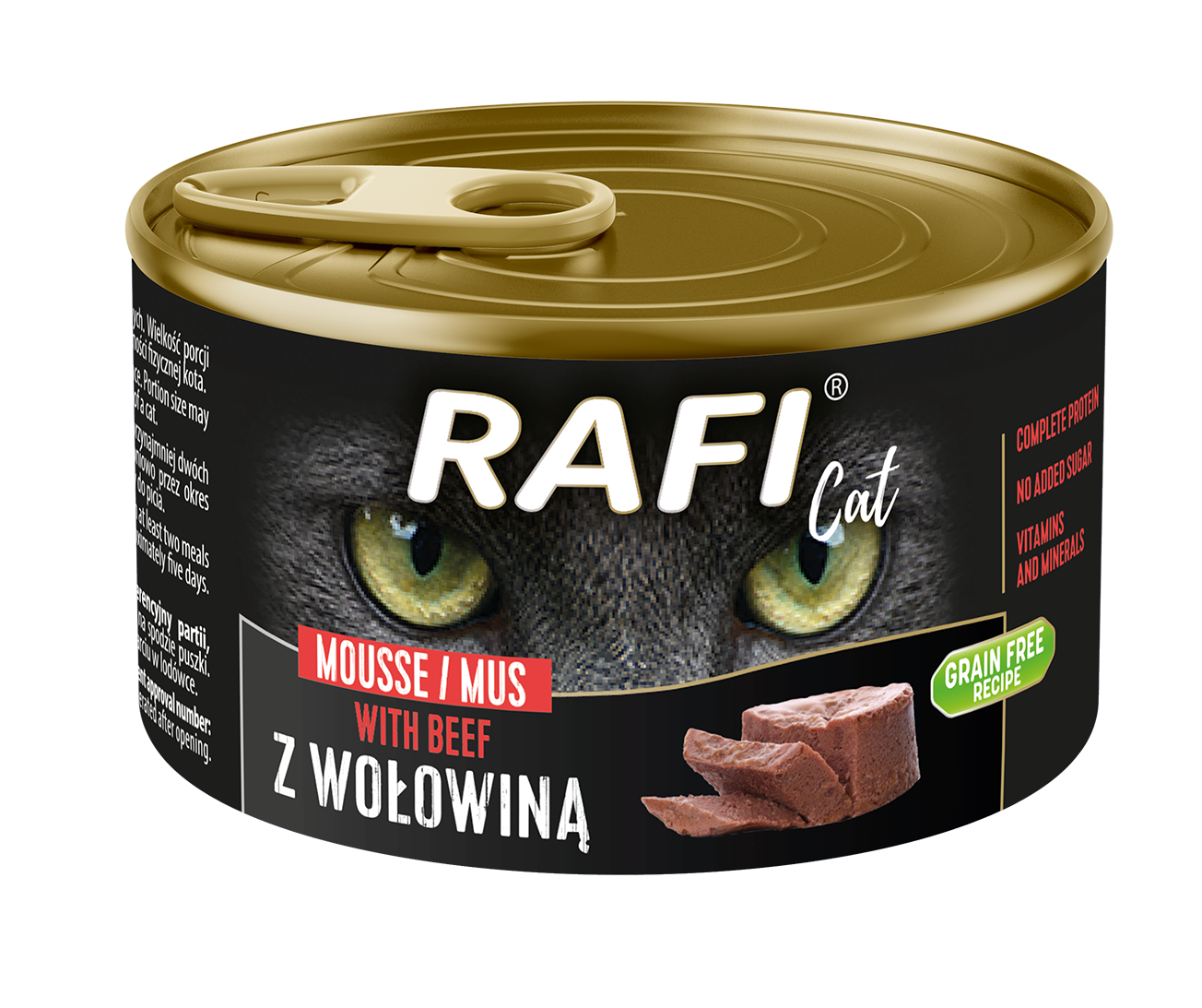 Pełnoporcjowa karma z wołowiną dla dorosłych kotów wszystkich ras Rafi MUS w pełni zaspokaja ich zapotrzebowanie na niezbędne składniki odżywcze. Jej prosty, a jednocześnie wartościowy skład dostarcza białka i tłuszczu o wysokiej przyswajalności, wspierając zdrowie i witalność zwierzęcia. Surowce rybne wzbogacają dietę w kwasy tłuszczowe omega-3, które są szczególnie istotne na każdym etapie życia kota. Dodatek tauryny odpowiada na specyficzne potrzeby metaboliczne organizmu. Receptura została starannie opracowana z zachowaniem optymalnego stosunku wapnia do fosforu, co wspiera prawidłowe funkcjonowanie układów kostnego, mięśniowego i wydalniczego. Dzięki mało inwazyjnej metodzie produkcji oraz starannie dobranym składnikom karma jest lekkostrawna, doskonale przyswajalna i idealnie dopasowana do potrzeb żywieniowych dorosłych kotów.