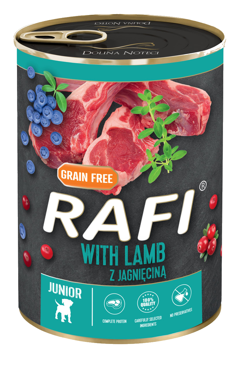 Mokra karma Rafi Junior z jagnięciną to produkt przeznaczony co codziennego żywienia szczeniąt oraz młodych psów. Ich dieta musi obfitować we wszystkie składniki odżywcze, niezbędne w harmonijnym wzroście i rozwoju ich organizmów. Dzięki zawartości wysokiej jakości mięsa i produktów pochodzenia zwierzęcego z jagnięciny, karma jest źródłem białka o cennym składzie aminokwasowym (metionina, izoleucyna i cystyna). Olej z łososia dostarcza wielonienasyconych kwasów tłuszczowych z rodziny n-6 regulujących procesy metaboliczne. Uważane są również za istotny czynnik stanowiący o odpowiedzi immunologicznej zwłaszcza w przypadku młodych organizmów. Dodatkowo mokra karma Rafi Junior z jagnięciną zapewnia odpowiednie zmineralizowanie kości i zębów, co ma duże znaczenie dla szczeniąt i młodych psów. Żurawina i borówka wzbogacają codzienną dietę psa o substancje przeciwutleniające i przeciwzapalne, a tymianek stymuluje wydzielanie soków trawiennych.