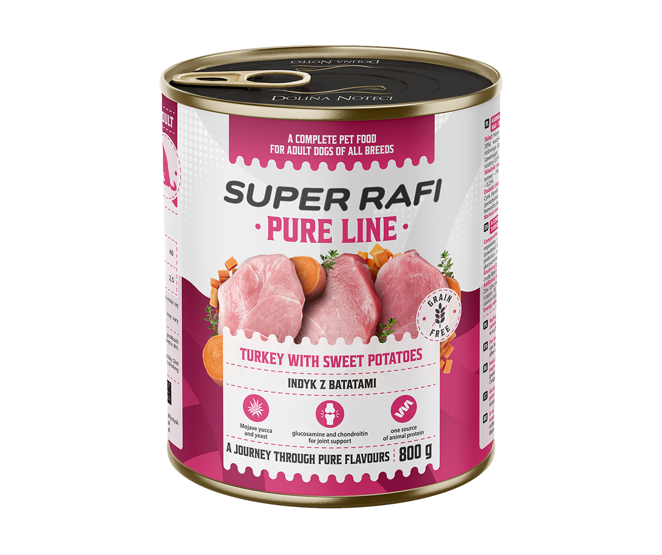 Super Rafi Pure Line – indyk z batatami to monobiałkowa karma pełnoporcjowa przeznaczona dla dorosłych psów wszystkich ras. Jest polecana szczególnie czworonogom z objawami alergii pokarmowej na inne źródła białka niż indyk. Karmy Super Rafi Pure Line pokrywają w 100% dzienne zapotrzebowanie na wszystkie składniki odżywcze. Ich wartościowy skład, obejmujący 65% mięsa i produktów pochodzenia zwierzęcego wyłącznie z indyka, jest źródłem białka o bardzo wysokiej strawności i jakości biologicznej. Obecność tkanki mięśniowej oraz podrobów, w tym tkanek łącznych będących źródłem naturalnych witamin i minerałów, zwiększa różnorodność składników odżywczych i korzystnie wpływa na właściwości smakowe produktu. Odpowiednio dobrane jakość i ilość białka oraz tłuszczu zapewniają psu zarówno komplet niezbędnych aminokwasów i kwasów tłuszczowych, jak i energię konieczną do prawidłowego funkcjonowania organizmu.