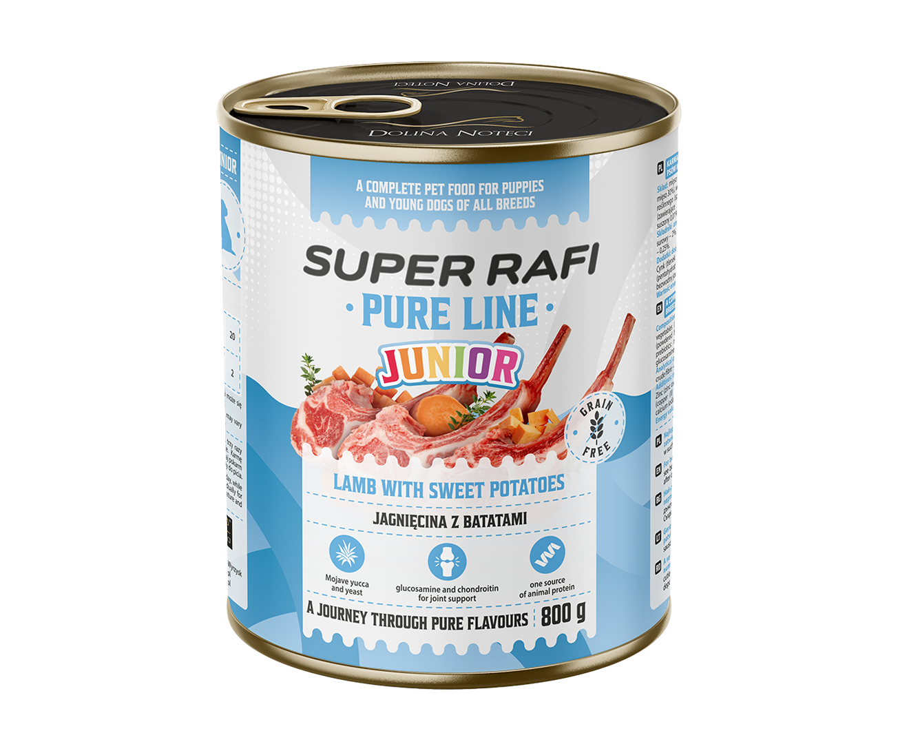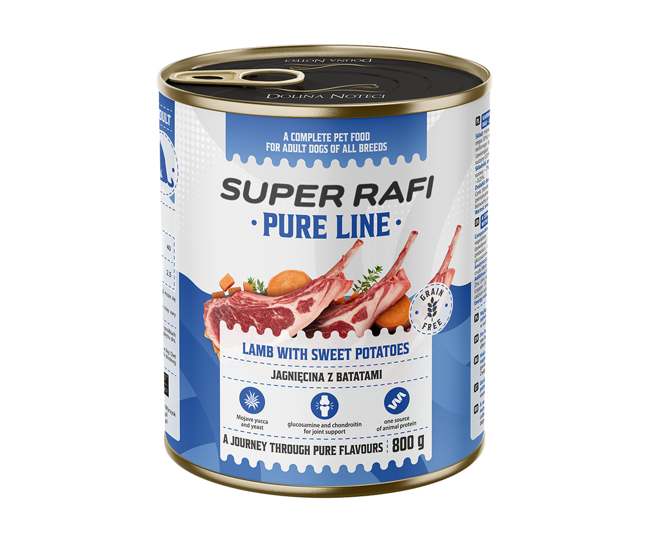 Super Rafi Pure Line – jagnięcina z batatami to monobiałkowa karma pełnoporcjowa przeznaczona dla rosnących psów wszystkich ras. Jest polecana szczególnie czworonogom z objawami alergii pokarmowej na inne źródła białka niż jagnięcina. Karmy Super Rafi Pure Line pokrywają w 100% dzienne zapotrzebowanie na wszystkie składniki odżywcze. Ich wartościowy skład, obejmujący 65% mięsa i produktów pochodzenia zwierzęcego wyłącznie z jagnięciny, jest źródłem białka o bardzo wysokiej strawności i jakości biologicznej. Obecność tkanki mięśniowej oraz podrobów, w tym tkanek łącznych będących źródłem naturalnych witamin i minerałów, zwiększa różnorodność składników odżywczych i korzystnie wpływa na właściwości smakowe produktu. Odpowiednio dobrane jakość i ilość białka oraz tłuszczu zapewniają psu zarówno komplet niezbędnych aminokwasów i kwasów tłuszczowych, jak i energię konieczną do prawidłowego funkcjonowania organizmu.